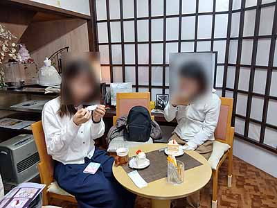 カラー診断は、診断用の布を使って顔色の違いを目の前で体験できます。色によるお顔の映え方の違いに、驚きと感激の声があがっていました。似合う色を診断していただき、それに沿ったメイクやドレス選びで、いつもと違う自分に変身♡着替えた後はケーキとお茶でゆっくりくつろいでからお帰りいただきました。